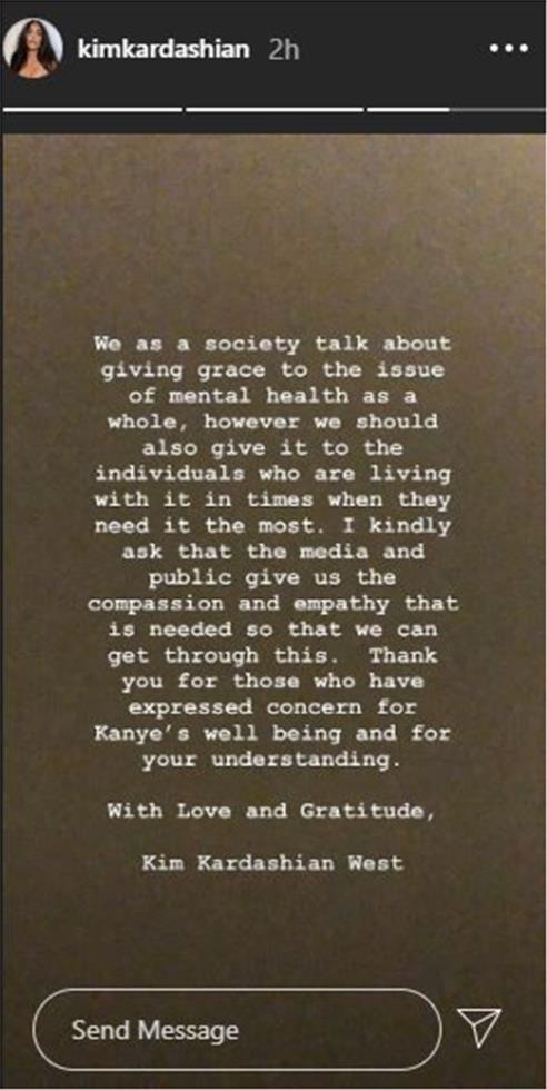 Εμείς ως κοινωνία μιλάμε για την εύνοια που πρέπει να τυγχάνει το θέμα της ψυχικής υγείας συνολικά, όμως πρέπει να δίνουμε την αντίστοιχη σημασία στα άτομα που ζουν με αυτό, τις στιγμές που το έχουν περισσότερο ανάγκη. Ζητώ ευγενικά από τα media και την κοινή γνώμη να δείξουν την ευαισθησία και την ενσυναίσθηση που απαιτείται, ώστε να μπορέσουμε να ξεπεράσουμε όλο αυτό. Ευχαριστώ όλους όσοι εξέφρασαν ανησυχία για την υγεία του Kanye και την κατανόησή σας.