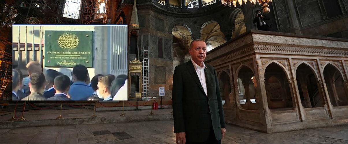 Στη συνέχεια, μαζί με τους ακολούθους του, ο Ερντογάν βγήκε έξω από την Αγία Σοφία και κατευθύνθηκε σε ένα σημείο του μνημείου, από το οποίο άρχισε να ξεκολλά ένα λευκό χαρτί, το οποίο κάλυπτε το νέο όνομα της Αγίας Σοφίας. Κάτω από αυτό το χαρτί, υπήρχε η επιγραφή - γραμμένη στα αγγλικά: Αγία Σοφία, το μεγάλο τζαμί. Ο Ρετζέπ Ταγίπ Ερντογάν αλλαξε και την ταμπέλα από το μνημείο.