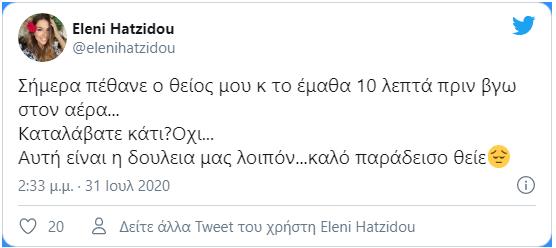 «Σήμερα πέθανε ο θείος μου και το έμαθα 10 λεπτά πριν βγω στον αέρα… Καταλάβατε κάτι? Όχι… Αυτή είναι η δουλειά μας λοιπόν… Καλό παράδεισο θείε», έγραψε η Ελένη Χατζίδου.