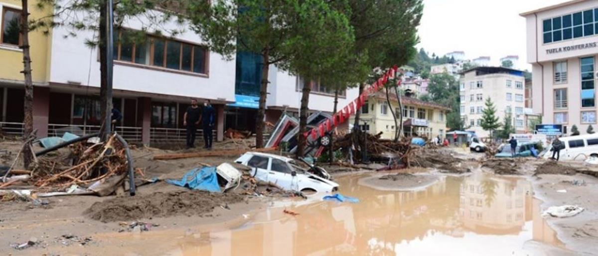 Εικόνες από τη βόρεια επαρχία Γκιρεσούν (Κερασούντας), έπειτα από ασυνήθιστα σφοδρές βροχοπτώσεις, δείχνουν τα νερά να παρασύρουν κτίρια και οχήματα σ’ έναν δρόμο.