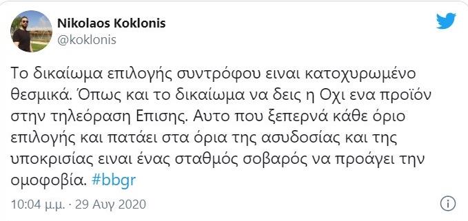 Ο Νίκος Κοκλώνης λοιπόν, φανερά ενοχλημένος από αυτή την κίνηση της παραγωγής έγραψε στο Twitter, «Το δικαίωμα επιλογής συντρόφου είναι κατοχυρωμένο θεσμικά. Όπως και το δικαίωμα να δεις ή όχι ένα προϊόν στην τηλεόραση επίσης. Αυτό που ξεπερνά κάθε όριο επιλογής και πατάει στα όρια της ασυδοσίας και της υποκρισίας είναι ένας σταθμός σοβαρός να προάγει την ομοφοβία».