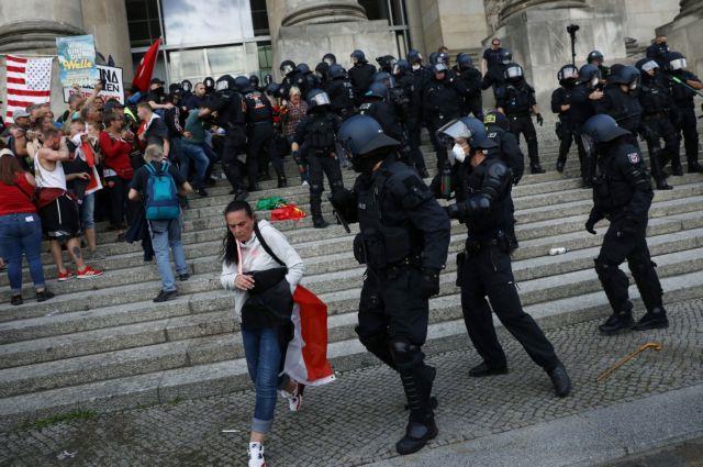 Χθες Σάββατο βράδυ πολλές εκατοντάδες διαδηλωτές έσπασαν τα κάγκελα ασφαλείας και ένα μπλόκο της αστυνομίας και ανέβηκαν τα σκαλοπάτια που οδηγούν στην είσοδο του Ράιχσταγκ. Οι δυνάμεις της τάξης τους εμπόδισαν την τελευταία στιγμή να εισέλθουν στο κτίριο, κάνοντας χρήση σπρέι για να διαλύσουν το πλήθος, ενώ προχώρησαν και σε πολλές συλλήψεις.
