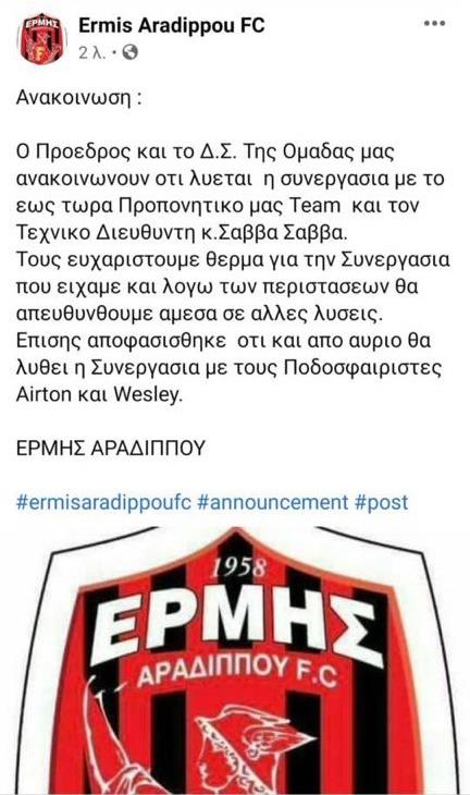 Ανάρτηση με την οποία ανακοίνωνε τη λύση της συνεργασίας του με τον προπονητή της ομάδας, το προπονητικό τιμ και τον τεχνικό διευθυντή Σάββα Σάββα, ανήρτησε την ώρα του αγώνα με τον Απόλλωνα ο Ερμής Αραδίππου.