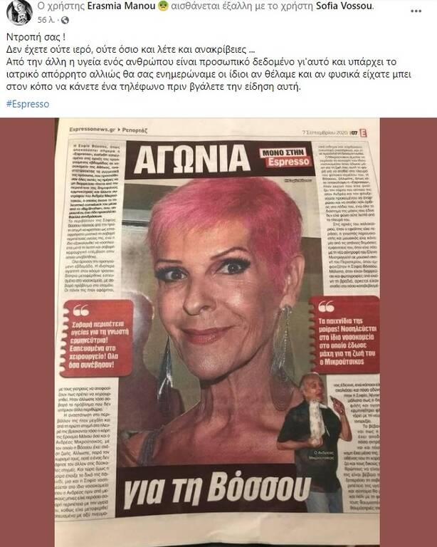 “Το ότι εγώ πεθαίνω και δεν το ξέρω και το ξέρει η espresso είναι πάρα πολύ σημαντικό που έχουμε τέτοια δημοσιογραφία στην χώρα μας ένα έχω να πω ας σταματήσει αυτό το βρώμικο παιχνίδι εγώ δεν κρύβω κάτι χειρουργήθηκα μετεγχειρητική κήλη από ένα χειρουργείο πέρσι το Σεπτέμβρη που ‘χα κάνει και έπρεπε να γίνει αυτό το πράγμα και έγινε εσπευσμένα με την έννοια ότι είχα και αναβολές διαφορές από το πρόγραμμα μου λόγω κορονοϊού το κοινοποιώ για να μην ανησυχείτε όλοι φίλοι μου είναι μια χαρά ότι διαβάζετε και είναι ψευδές εκτός του ότι έχω κάνει το χειρουργείο το οποίο ήταν ένα απλό χειρουργείο ...ΕΠΕΙΔΗ ΟΜΩΣ ΕΧΩ ΞΕΡΑΣΕΙ ΜΕ ΟΛΑ ΑΥΤΑ ΘΑ ΚΙΝΗΘΩ ΝΟΜΙΚΑ ΔΙΟΤΙ ΚΑΝΕΙΣ ΔΕΝ ΜΟΥ ΤΗΛΕΦΩΝΗΣΕ ΑΠΟ ΤΟ ΣΥΓΚΕΚΡΙΜΕΝΟ ΕΝΤΥΠΟ ΝΑ ΜΕ ΡΩΤΗΣΕΙ ΚΑΤΙ ......ΑΥΤΑ .....Ο ΚΟΜΠΟΣ ΕΧΕΙ ΦΤΑΣΕΙ ΣΤΟ ΧΤΕΝΙ .......ΕΛΕΟΣ .....ΔΕΝ ΠΕΟΑΙΝΩ ΕΤΣΙ ΕΥΚΟΛΑ ΕΓΩ. ΚΑΛΗ ΜΑΣ ΕΒΔΟΜΑΔΑ ΑΓΑΠΕΣ ΜΟΥ ΣΑΣ ΛΑΤΡΕΥΩ”, έγραψε η Σοφία Βόσσου στο post της.