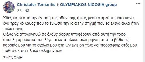 Σε ανάρτησή του στα μέσα κοινωνικής δικτύωσης, ο κ. Τορναρίτης αναφέρει, «χθες κάτω από την ένταση της οδυνηρής ήττας μέσα στη λύπη μου, έκανα ένα τραγικό λάθος που το ένιωσα την ίδια την στιγμή που το έλεγα, αλλά ήταν πολύ αργά».