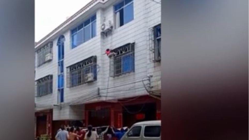 Μια τετράχρονη μικρούλα που, άγνωστο υπό ποιες συνθήκες, βρέθηκε να κρέμεται έξω από ένα παράθυρο σπιτιού στην επαρχία Τσιανγκσί της Κίνας, γλίτωσε από σοβαρό τραυματισμό - ή ακόμη και θάνατο - χάρη στην άμεση παρέμβαση των κατοίκων της περιοχής.
