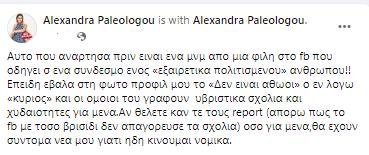 Ένα απίστευτα προσβλητικό σχόλιο από κάποιον στο facebook, που σχολίασε την φωτογραφία στο προφίλ της, δέχθηκε η ηθοποιός Αλεξάνδρα Παλαιολόγου!