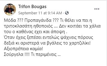 Η Αλεξάνδρα έγραψε: “Αυτό που ανάρτησα πριν είναι ένα μνμ απο μια φίλη στο fb που οδηγεί σ ενα σύνδεσμο ενος «εξαιρετικά πολιτισμένου» ανθρώπου!!Επειδή έβαλα στη φώτο προφίλ μου το «Δεν είναι αθώοι» ο εν λογω «κύριος» και οι όμοιοι του γράφουν υβριστικά σχόλια και χυδαιότητες για μένα. Αν θέλετε κάντε τους report (απορώ πως το fb με τόσο βρισίδι δεν απαγόρευσε τα σχόλια) όσο για μένα,θα έχουν σύντομα νέα μου γιατί ήδη κινούμαι νομικά.