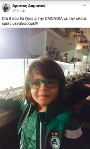 Από την πλευρά του, ο Άριστος Δαμιανού έβαλε τη φωτογραφία του γιου του και έγραψε, στα οκτώ σου θα ζήσεις την Ομόνοια, με την οποία εμείς μεγαλώσαμε».
