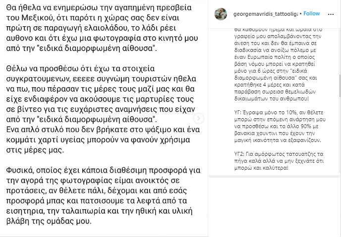ΥΓ2: Για αμόρφωτος τατουατζης τα πήγα καλά αλλά να μην ξεχνάτε ότι μπορώ και καλύτερα!», έγραψε ο Γιώργος Μαυρίδης.