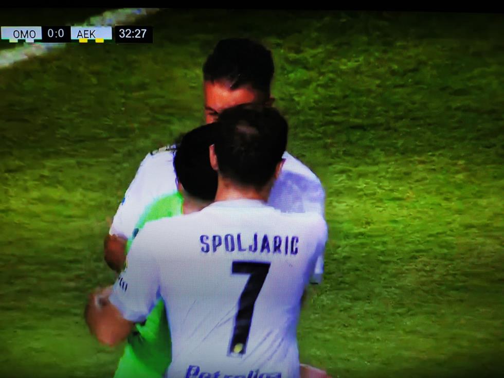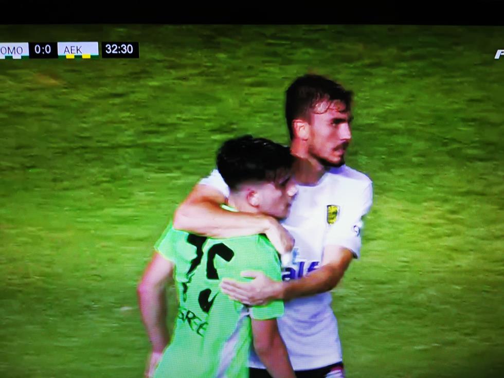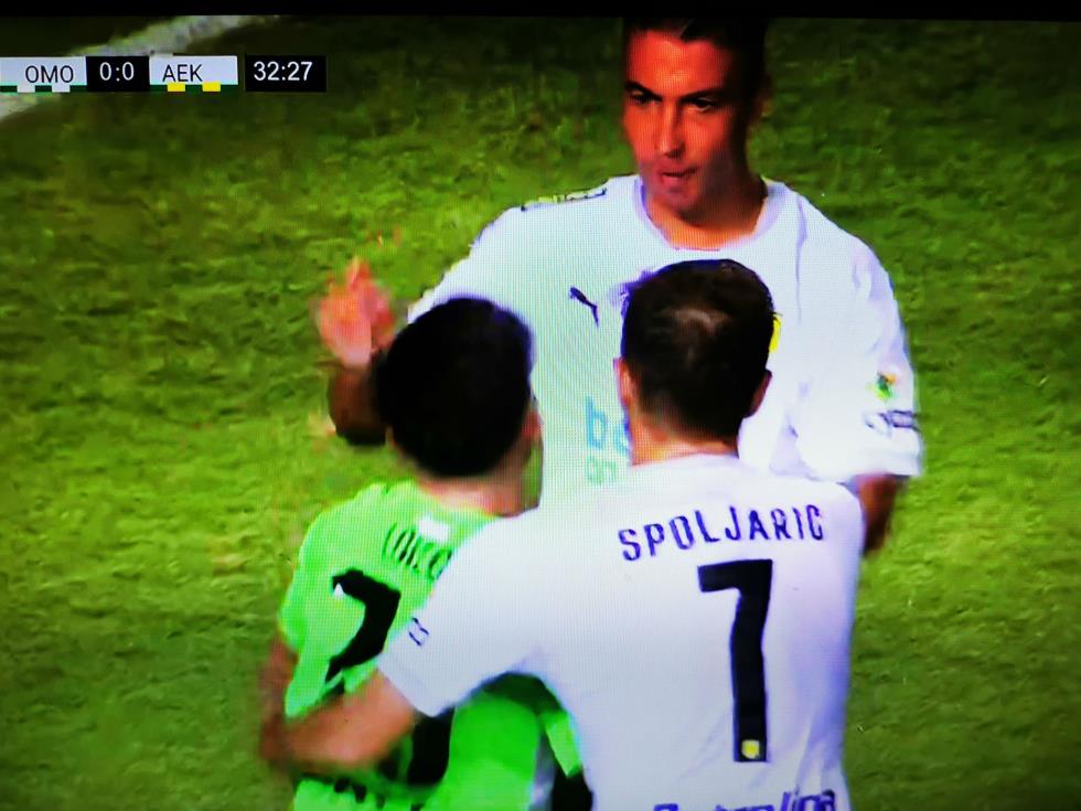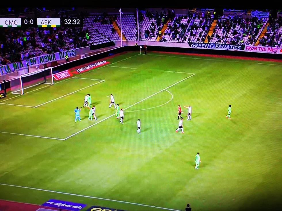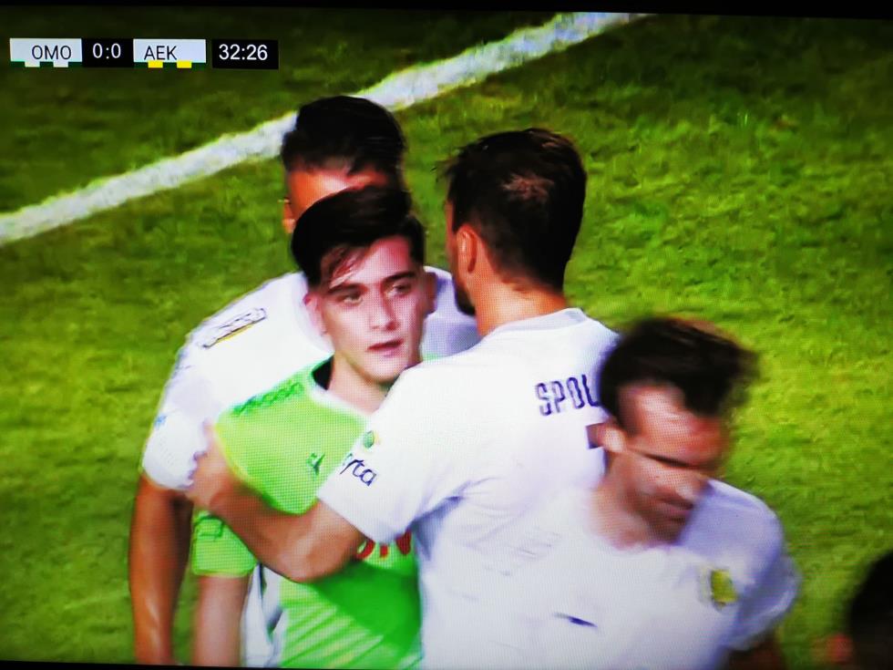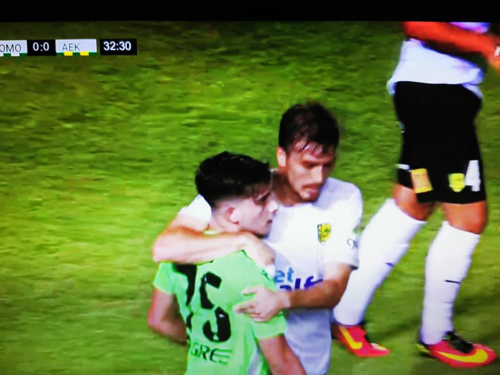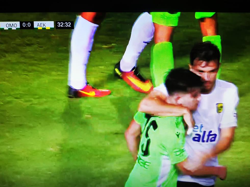 Ο ποδοσφαιριστής της Ομόνοιας διαμαρτυρήθηκε έντονα ζητώντας πέναλτι, με τον διαιτητή να του δείχνει να συνεχιστεί το παιχνίδι.