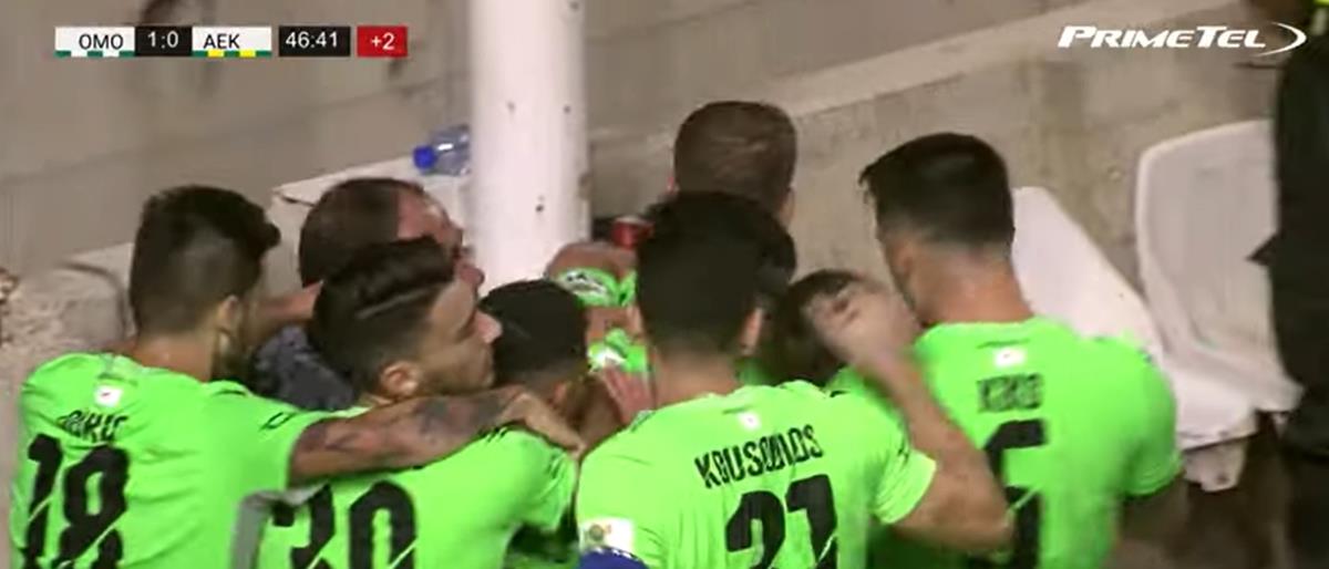Κεφάλι στο σκορ λίγο πριν την ανάπαυλα πήρε η Ομόνοια, στο ντέρμπι με την ΑΕΚ, με τους 700 περίπου οπαδούς της που βρίσκονται στις εξέδρες του ΓΣΠ να ξεσπάνε και φωνάζουν «Ομόνοια αιώνια».
