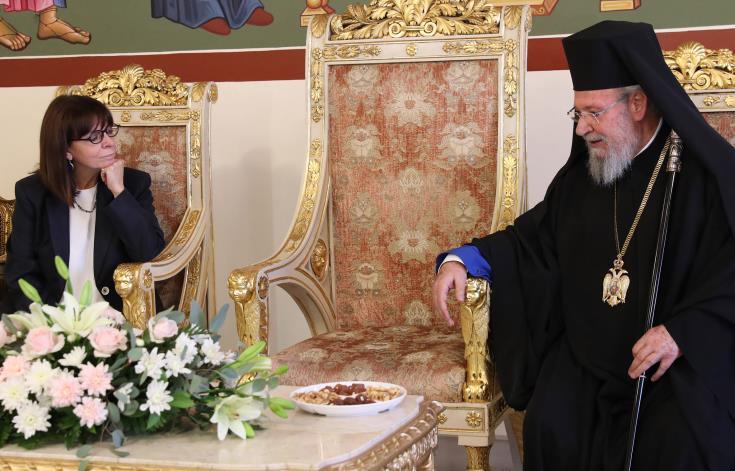 Τον σημαντικό ρόλο που διαδραματίζει η Εκκλησία της Κύπρου ως προς τον διαθρησκευτικό διάλογο ως μέσο κατανόησης και συμφιλίωσης των λαών αλλά και στις ενέργειές της για διατήρηση της ορθόδοξης πολιτιστικής μας κληρονομιάς στα κατεχόμενα επικεντρώθηκε η Πρόεδρος της Ελληνικής Δημοκρατίας, Κατερίνα Σακελλαροπούλου, στην ενώπιον των ΜΜΕ συνομιλία της με τον Προκαθήμενο της Εκκλησίας της Κύπρου, Αρχιεπίσκοπο Χρυσόστομο ΙΙ, στο πλαίσιο της επίσημης επίσκεψής της στην Κύπρο.