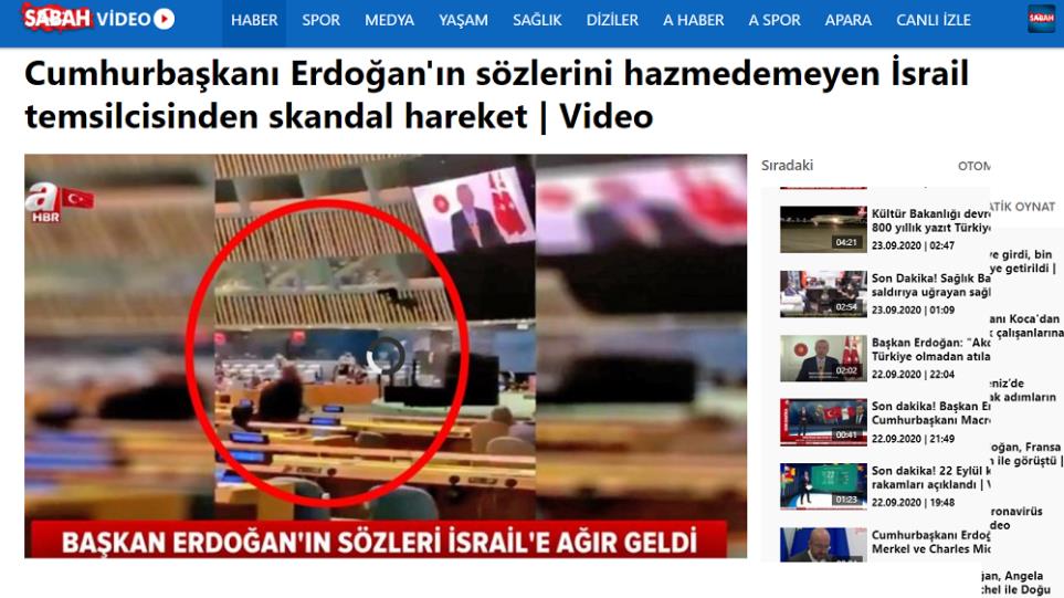Με την έναρξη μετάδοσης την Τρίτη της μαγνητοσκοπημένης ομιλίας του Τούρκου προέδρου Ταγίπ Ερντογάν, αποχώρησε από την αίθουσα της Γενικής Συνέλευσης του Οργανισμού Ηνωμένων Εθνών ο Ισραηλινός πρέσβης στον ΟΗΕ, Γκιλάντ Ερντάν. Η αποχώρηση καταγράφηκε από κάμερα κινητού τηλεφώνου.