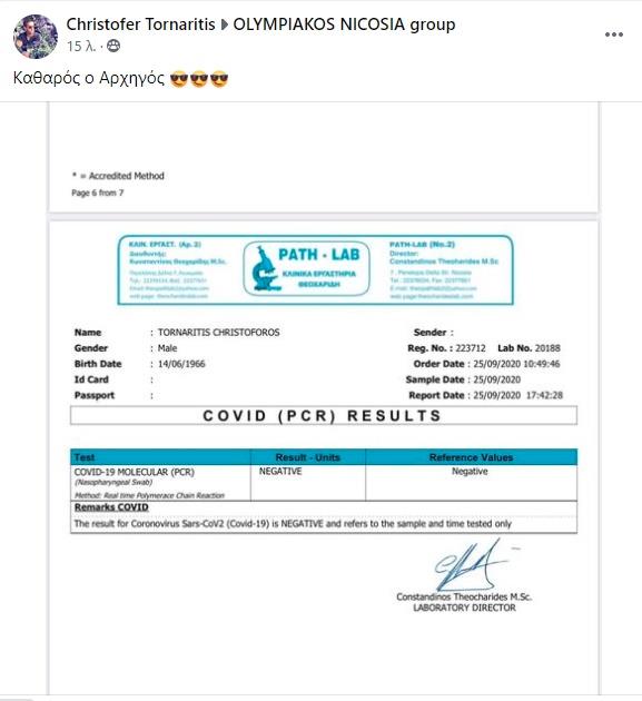 Φωτογραφία από το αποτέλεσμα του τεστ κορωνοϊού στο οποίο υποβλήθηκε, ανήρτησε ο γενικός αρχηγός του Ολυμπιακού Χριστόφορος Τορναρίτης.