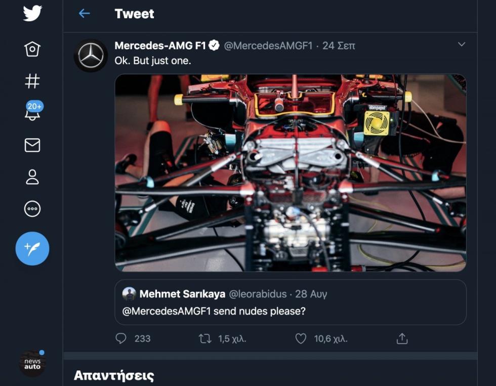 Μία από αυτές αλιέψαμε πριν λίγες ώρες, με την ομάδα να απαντά στο αίτημα αναγνώστη με αφορμή το Αυγουστιάτικό «ζήτα ότι θέλεις» της Mercedes-AMG F1, «στείλε γυμνές φωτογραφίες».