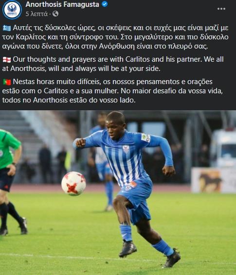 «Αυτές τις δύσκολες ώρες, οι σκέψεις και οι ευχές μας είναι μαζί με τον Καρλίτος και τη σύντροφο του. Στο μεγαλύτερο και πιο δύσκολο αγώνα που δίνετε, όλοι στην Ανόρθωση είναι στο πλευρό σας»., αναφέρει η ομάδα της Αμμοχώστου.