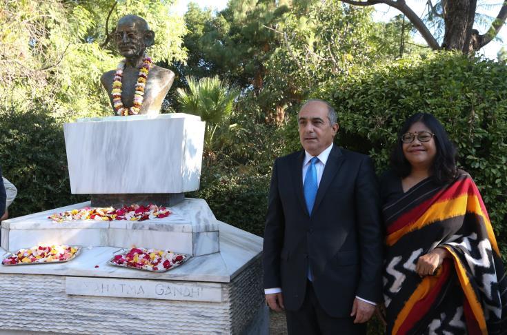 Σε τελετή στην προτομή του Μαχάτμα Γκάντι, δίπλα από το κτήριο της Βουλής, ο κ. Συλλούρης σημείωσε ότι η επέτειος εορτάζεται επίσης παγκοσμίως ως η Διεθνής Ημέρα της Μη Βίας, μετά από σχετική απόφαση του ΟΗΕ.