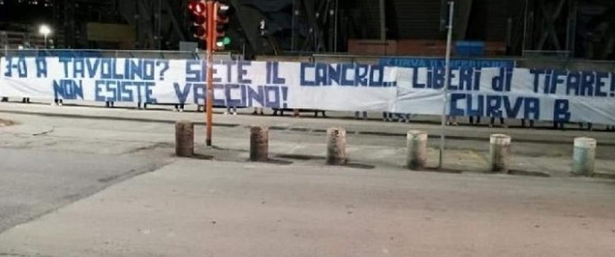 Πολύ σκληρά πανό κατά της Γιουβέντους από οπαδούς της Νάπολι έξω από το «Σαν Πάολο», μετά τη νίκη των Μπιανκονέρι στα χαρτιά με 3-0.