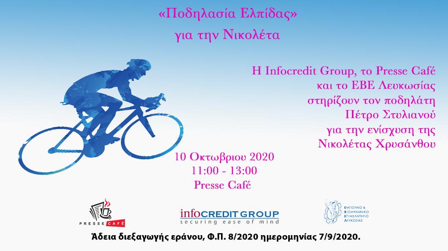 H Infocredit Group και το Presse Café στηρίζουν τον ποδηλάτη Πέτρο Στυλιανού στη «Ποδηλασία Ελπίδας» ενώνοντας τις δυνάμεις τους στη προσπάθεια για εξεύρεση συμβατού δότη μυελού των οστών και οικονομικής ενίσχυσης για την πολυδάπανη θεραπεία της Νικολέτας Χρυσάνθου. Την εκδήλωση στηρίζει το ΕΒΕ Λευκωσίας.