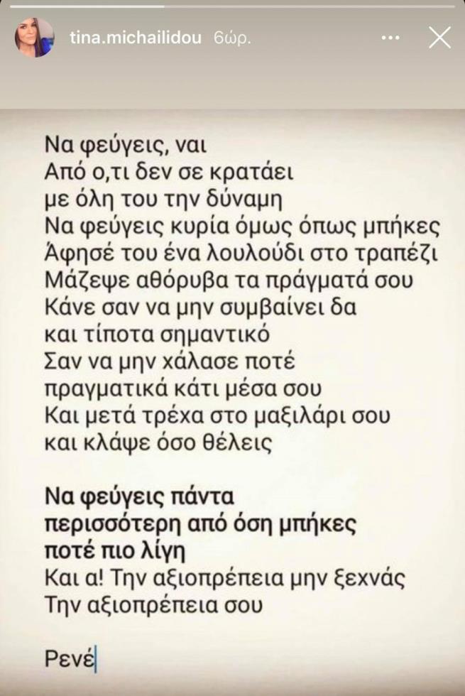 Η δημοσιογράφος, λίγες ώρες μετά τη γνωστοποίηση της λήξης της συνεργασίας της με τον Alpha προχώρησε σε μια ανάρτηση – καρφί, μέσα από τον προσωπικό της λογαριασμό στο instagram.