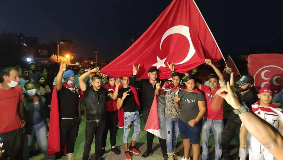 Όπως μεταδίδουν τα τουρκοκυπριακά μέσα, πρόκειται για περίπου 150 άτομα που κρατούν σημαίες της Τουρκίας και σχηματίζουν το σήμα των γκρίζων λύκων. Ακολούθως, έψαλλαν τον εθνικό ύμνο της Τουρκίας.