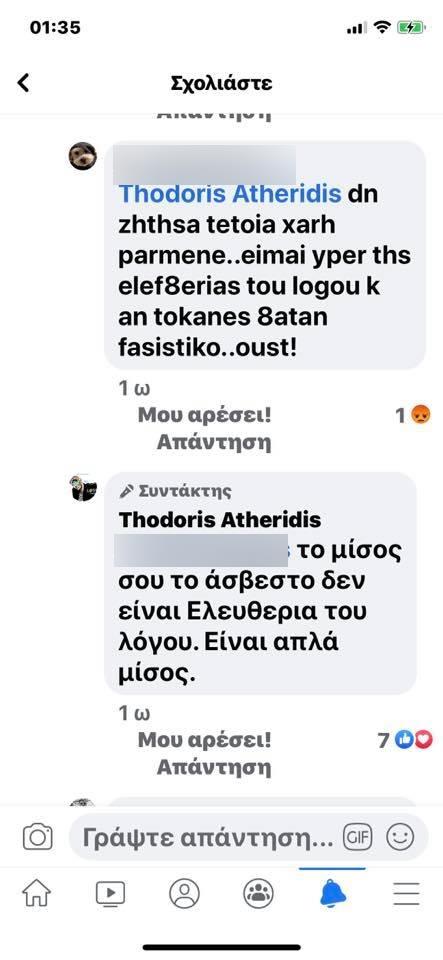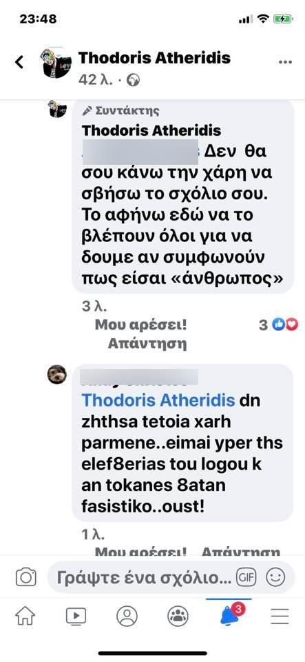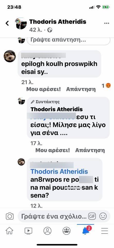 Χθες αργά τη νύχτα, ο Θοδωρής Αθερίδης, επανήλθε δημοσιεύοντας ξανά την ανάρτησή αλλά και φωτογραφημένα απίστευτα υβριστικά σχόλια χρήστη του facebook εναντίον του! Ο ηθοποιός χειρίστηκε με απόλυτη ψυχραιμία τις αισχρές ύβρεις του ανθρώπου αυτού, δίνοντας στη δημοσιότητα και τις απαντήσεις του.