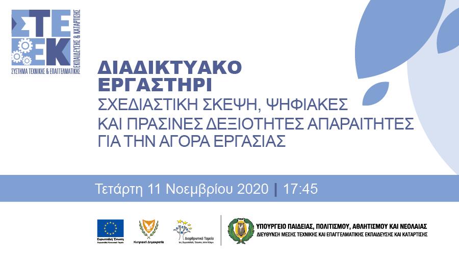 Η Διεύθυνση Μέσης Τεχνικής και Επαγγελματικής Εκπαίδευσης και Κατάρτισης (ΔΜΤΕΕΚ), του Υπουργείου Παιδείας, Πολιτισμού, Αθλητισμού και Νεολαίας στο πλαίσιο της υλοποίησης του Έργου «Ανάπτυξη της Τεχνικής και Επαγγελματικής Εκπαίδευσης και Κατάρτισης» και της Ευρωπαϊκής Εβδομάδας Επαγγελματικών Δεξιοτήτων, διοργανώνει Διαδικτυακό Εργαστήρι με τίτλο: «Σχεδιαστική Σκέψη, ψηφιακές και πράσινες δεξιότητες απαραίτητες για την αγορά εργασίας».