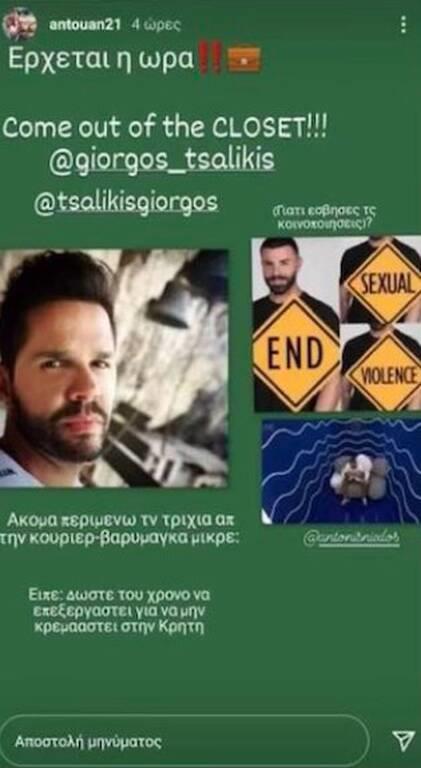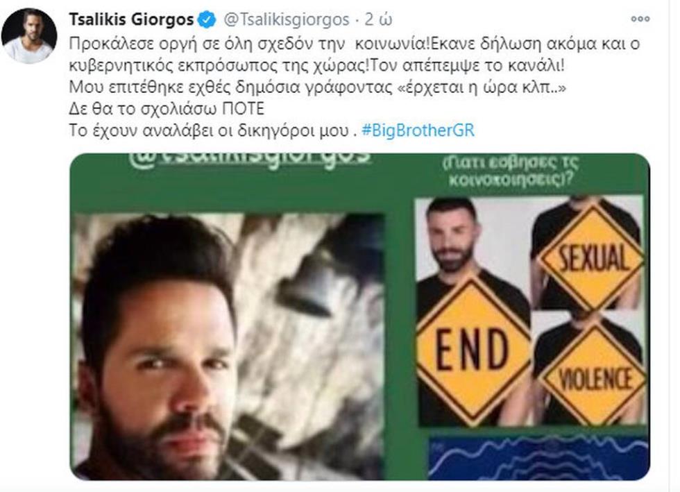 O παίκτης, ο οποίος αποβλήθηκε από το ριάλιτι, έπειτα από σχόλια τα οποία προκάλεσαν την οργή του κόσμου, με μια ανάρτησή του, επιτέθηκε δημόσια στον Γιώργο Τσαλίκη, γράφοντας «έρχεται η ώρα κλπ..».