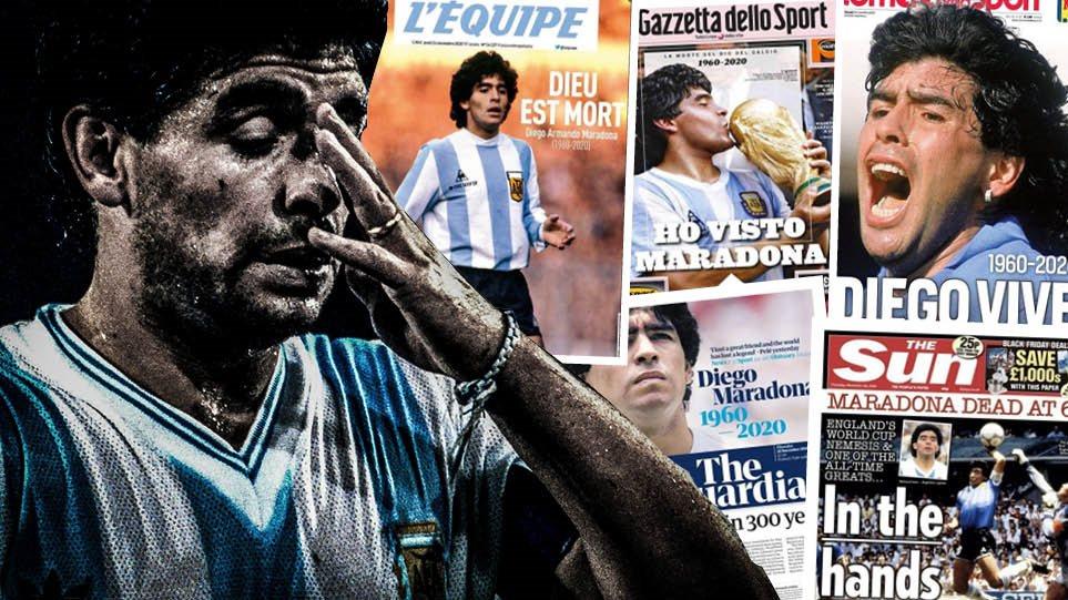 Ακολουθούν μερικά από τα πιο χαρακτηριστικά πρωτοσέλιδα και εξώφυλλά στον διεθνή Τύπο, με πιο εμβληματικό όλων, εκείνο της γαλλικής «L' Equipe»: «Ο Θεός πέθανε»... Ξεχωριστός και ο αποχαιρετισμός της βρετανικής «Sun», που υποκλίνεται στην ποδοσφαιρική «Νέμεση» των Άγγλων, όπως αποκαλεί τον Μαραντόνα, γράφοντας ότι πλέον βρίσκεται «στα χέρια του Θεού» και επιλέγοντας για το πρωτοσέλιδο τη φωτογραφία με το... χέρι του Θεού, το περίφημο γκολ του Μαραντόνα κόντρα στον Πίτερ Σίλτον, στο Μουντιάλ του 1986, που δεν θα έπρεπε να είχε μετρήσει ποτέ.