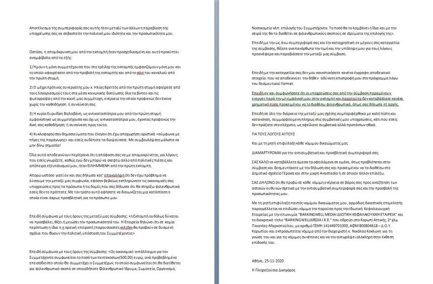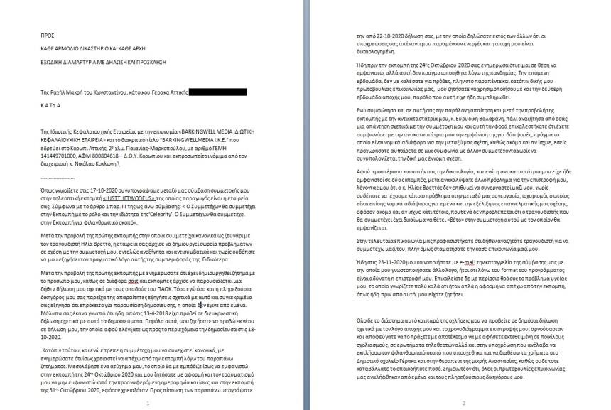 Δες παρακάτω όσα αναφέρει το εξώδικο που απέστειλε η Ραχήλ Μακρή.
