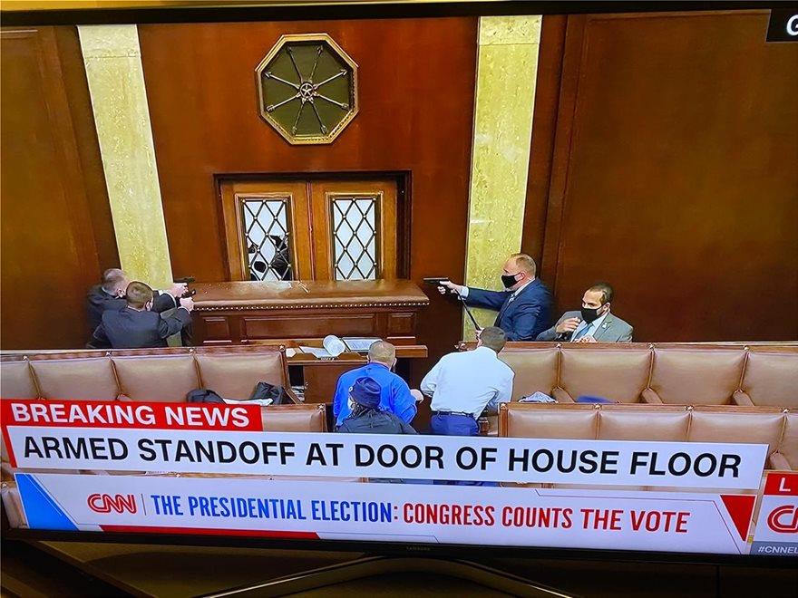 Με το δάχτυλο στη σκανδάλη αστυνομικοί προσπαθούν να αποτρέψουν την είσοδο των διαδηλωτών στο Καπιτώλιο και να προστατεύσουν γερουσιαστές και βουλευτές από τους εισβολείς οπαδούς του Τραμπ
