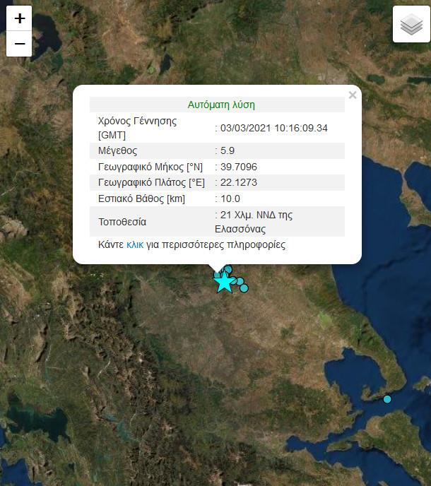 Σύμφωνα με τα αυτοματοπιοημένα στοιχεία από το Γεωδυναμικό Ινστιτούτο, ο σεισμός είχε μέγεθος 5,9 Ρίχτερ, πραγματοποιήθηκε 21 χλμ ΝΝΔ της Ελασσόνας και είχε εστιακό βάθος 10 χιλιόμετρα.