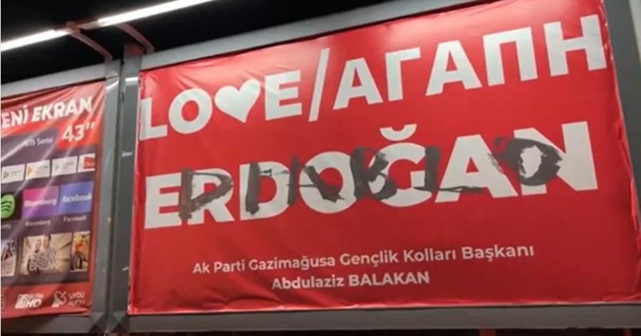 Η αντίδραση των Τ/κ στα συνθήματα “Love Erdoğan” που εμφανίστηκαν τις τελευταίες δύο ημέρες στα κατεχόμενα παίρνει νέα τροπή. Στην Αμμόχωστο όπου εμφανίστηκε το πανό “Love/αγάπη Erdoğan” άγνωστοι έγραψαν πάνω από το επίθετο του Τούρκου Προέδρου την λέξη “Diablo” και σύμφωνα με τα τ/κ ΜΜΕ, η «αστυνομία» προχωρεί σε έρευνα γι’ αυτό.