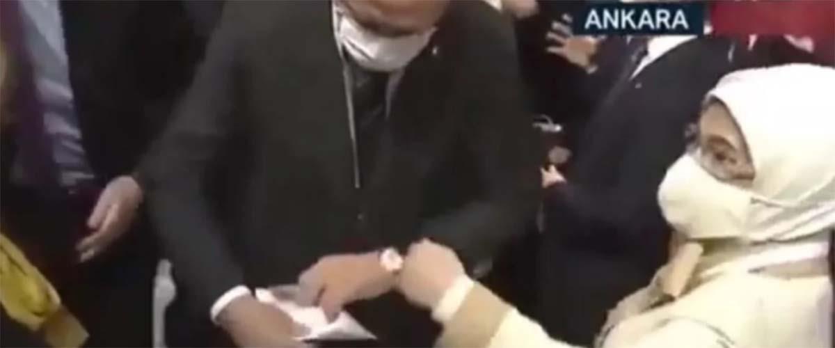 Εμφανώς οργισμένη, όπως φαίνεται και στο σχετικό βίντεο, η πρώτη κυρία της Τουρκίας παρενέβη, τινάζοντας την πλάτη του Ερντογάν, πιθανώς για να απομακρύνει τυχόν... ιούς, βάζοντας το χέρι της μπροστά του για να τον προστατέψει από εκείνους που τον πλησίαζαν σε απόσταση αναπνοής και καλώντας τους σωματοφύλακές του να επιληφθούν της κατάστασης, όπως μετέδωσε η τουρκική εφημερίδα Cumhuriyet.