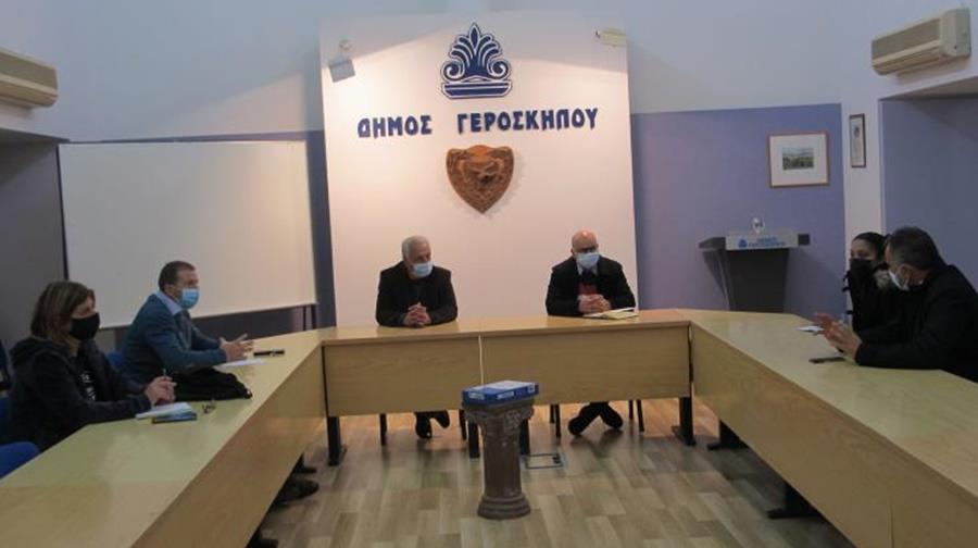 Συνάντηση πραγματοποιήθηκε, στο Δημαρχείο Γεροσκήπου μεταξύ του Δημάρχου Γεροσκήπου Μιχάλη Παυλίδη και Λειτουργών του Δήμου σε σχέση με την έναρξη, στην Γεροσκήπου, του Προγράμματος Προληπτικής Νοσηλευτικής Ψυχικής Υγείας «Εξέλιξις» της Διεύθυνσης Νοσηλευτικών Υπηρεσιών του Υπουργείου Υγείας.