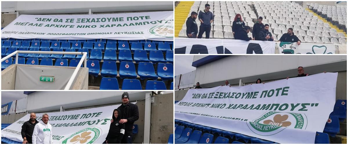 Οι πράσινοι προς τιμή του Νίκου Χαραλάμπους που έφυγε από τη ζωή, ανάρτησαν πανό στις κερκίδες του ΓΣΠ για να γράψουν, «Δεν θα σε ξεχάσουμε ποτέ μεγάλε αρχηγέ Νίκο Χαραλάμπους».