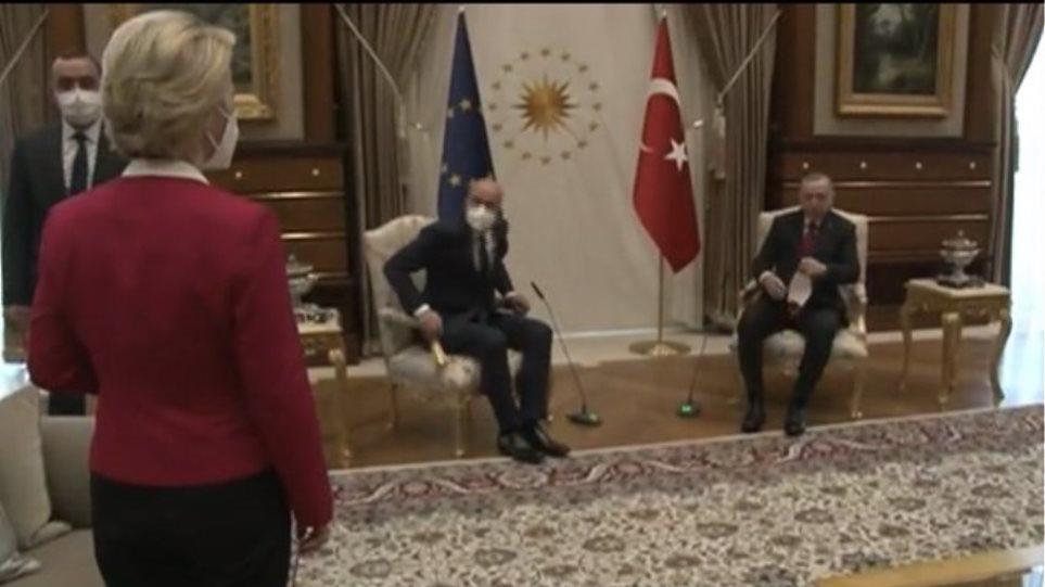 Ο διπλωματικός σύμβουλος της φον Ντερ Λάιεν, Φερνάντο Αντερσεν Γκιμαράες, μπήκε στην αίθουσα πριν από την έναρξη του επίσημου γεύματος -και προς μεγάλη του έκπληξη, είδε ότι είχαν τοποθετηθεί συνολικά 10 καρέκλες στο τραπέζι. Όμως, οι δύο είχαν πλάτη διπλασίου μεγέθους από τις υπόλοιπες -και τότε συνειδητοποίησε ότι σε αυτές επρόκειτο να καθήσουν οι κ.κ Ερντογάν καί Μισέλ, με την κα φον ντερ Λάιεν να περιορίζεται σε ρόλο... γραμματέα του προέδρου του Ευρωπαϊκού Συμβουλίου, καθώς δεν είχε προβλεφθεί καρέκλα για τον ίδιον.