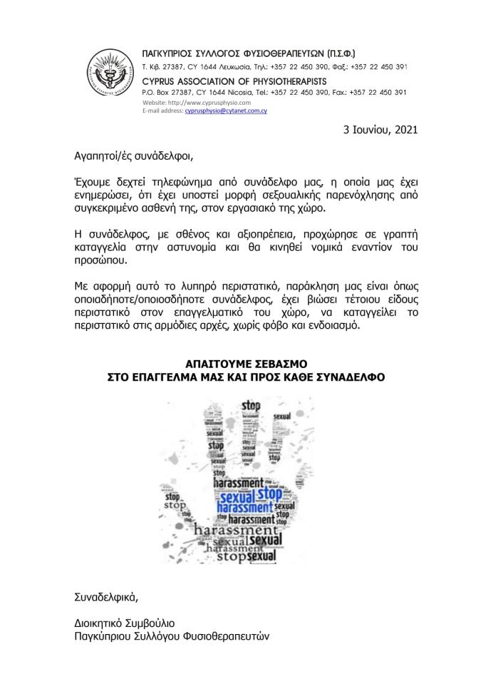 Ταυτόχρονα, ο Παγκύπριος Σύλλογος Φυσιοθεραπευτών καλεί τα μέλη του να καταγγέλλουν τέτοιου είδους περιστατικά στους χώρους εργασίας τους, χωρίς φόβο και ενδοιασμό.