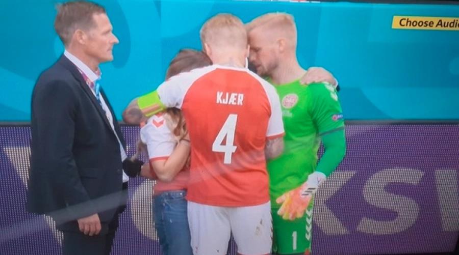Συκγλονιστικές εικόνες στην Κοπεγχάγη με τον Κρίστιαν Έρικσεν να καταρρέει στον αγωνιστικό χώρο και τους συμπαίκτες του, Κάσπερ Σμάιχελ και Σίμον Κιάερ, να αγκαλιάζουν τη σύντροφό του, η οποία κατέβηκε στον αγωνιστικό χώρο.