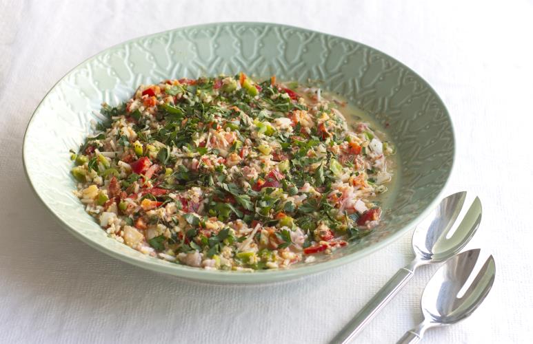 Βάλτε στον κάδο 100 γρ. κόκκινη πιπεριά σε ροδέλες, 100 γρ. πράσινη πιπεριά σε ροδέλες, 3 φέτες κρεμμύδι, 2 αυγά σφιχτά κομμένα στα 2, 20 γρ. ελαιόλαδο, 20 γρ. ξίδι, 1 κουταλάκι αλάτι και κόψτε 5 δευτερόλεπτα/ταχύτητα 4. Μεταφέρετε στη σαλατιέρα με τα θαλασσινά.