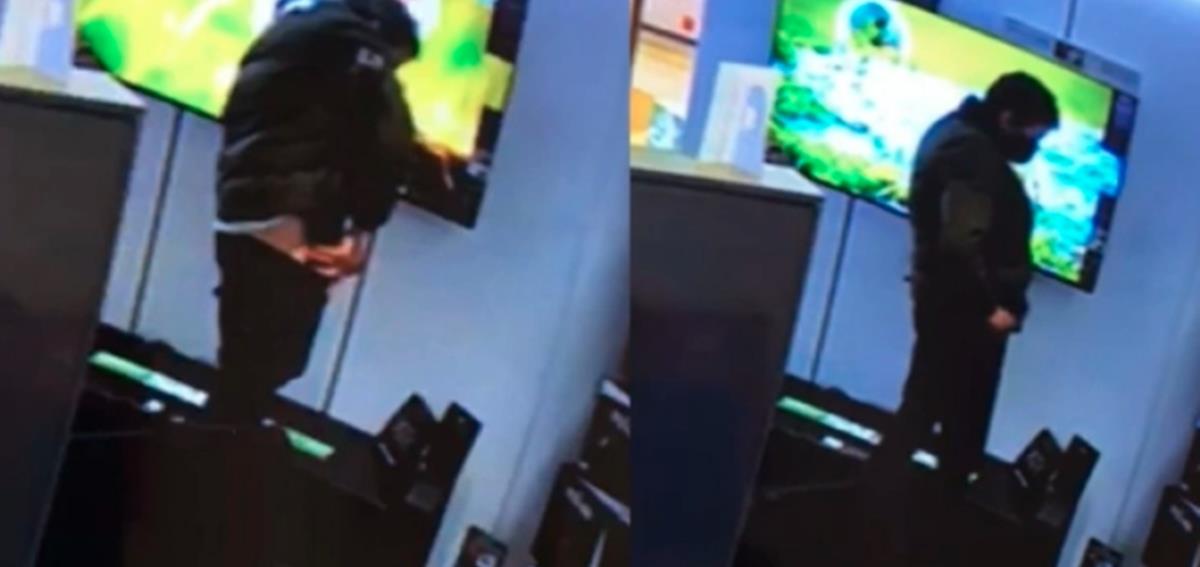 Το βίντεο δείχνει τον κλέφτη να σπρώχνει το ηχείο κάτω από το παντελόνι του και να προσπαθεί να κρύψει την άλλη άκρη του μέσα στο μπουφάν του. Ασφαλώς και η κρυψώνα του δεν ήταν η πιο πειστική και έτσι το προσωπικό του καταστήματος τον έπιασε προτού καταφέρει να φύγει.