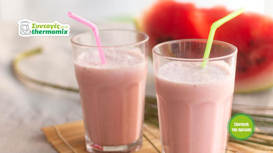 Προσθέστε 200 γρ. κρύο γάλα, 350 γρ. καρπούζι χωρίς κουκούτσια σε κομμάτια και πολτοποιήστε 20 δευτερόλεπτα/ταχύτητα 8.