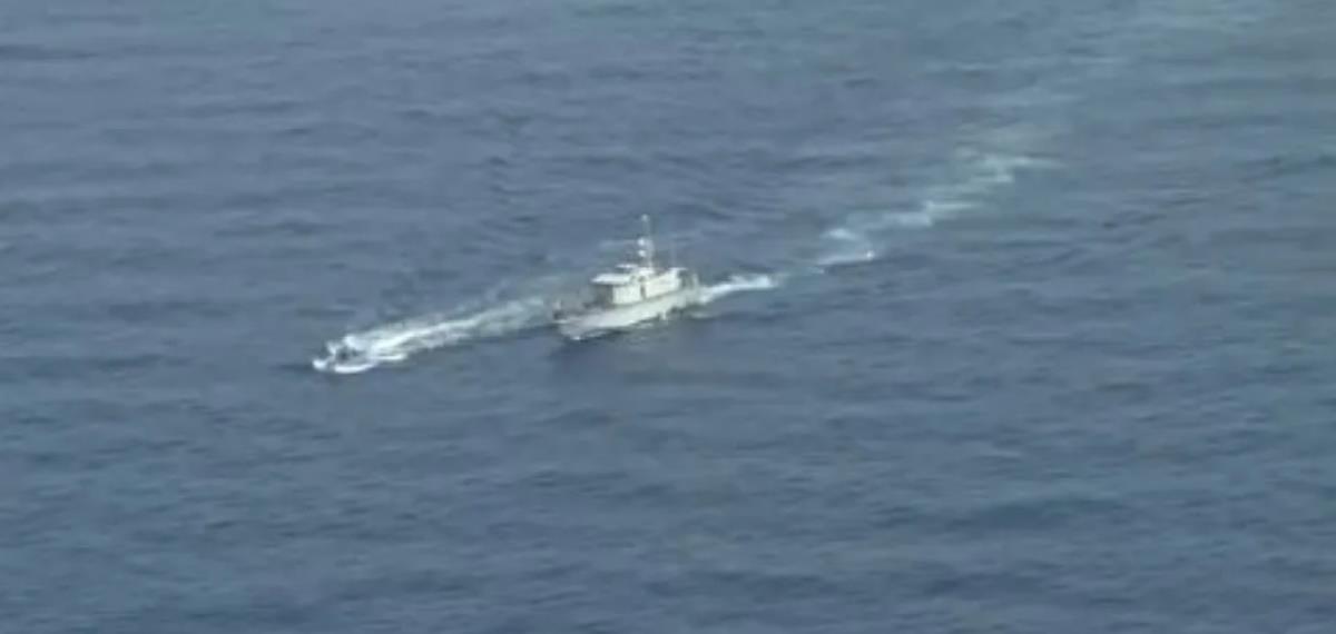 Οι εικόνες αυτές τραβήχθηκαν την Τετάρτη, από το αναγνωριστικό αεροσκάφος της μκο. Δύο σφαίρες πέφτουν στο νερό, σε απόσταση δύο-τριών μέτρων από την πλώρη του ξύλινου πλοιαρίου, στο οποίο επέβαιναν περίπου 50 άνθρωποι.