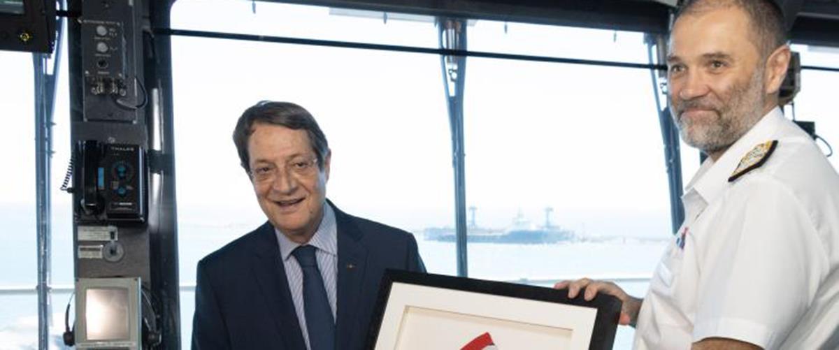 Ο Πρόεδρος Αναστασιάδης επισκέφθηκε το βρετανικό αεροπλανοφόρο, που έχει ελλιμενιστεί στο λιμάνι Λεμεσού από την περασμένη Πέμπτη, στην παρουσία του Ύπατου Αρμοστή της Βρετανίας, Stephen Lilly, του Διοικητή των Βρετανικών Βάσεων στην Κύπρο Rob Thomson και άλλων αξιωματούχων.