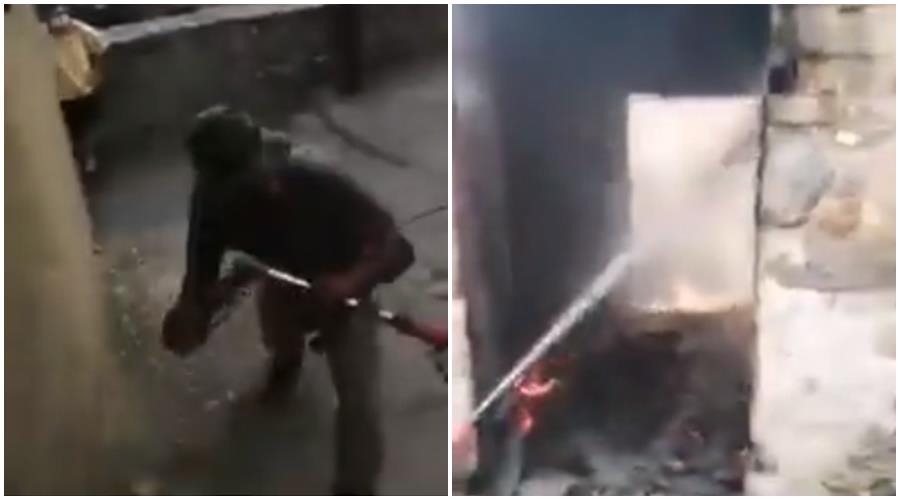 Κρατώντας μάνικα, οι εθελοντές κάνουν απέλπιδες προσπάθειες να κατασβέσουν τη φωτιά, που έχει επηρεάσει κατοικίες, με έναν εξ αυτών να φωνάζει «έλα ποδά τζιαι παίρνει το σπίτι».