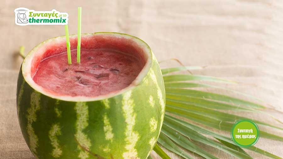 Βάλτε στον κάδο τη μισή ποσότητα ψύχας καρπουζιού (περίπου 1600 γρ.) και πολτοποιήστε 30 δευτερόλεπτα/ταχύτητα 9. Επαναλάβετε τη διαδικασία με το υπόλοιπο μισό της ψύχας καρπουζιού. Μεταφέρετε το χυμό καρπούζι στην κούπα από καρπούζι, καλύψτε με πλαστική μεμβράνη και βάλτε στο ψυγείο για περίπου 1 ώρα να παγώσει.