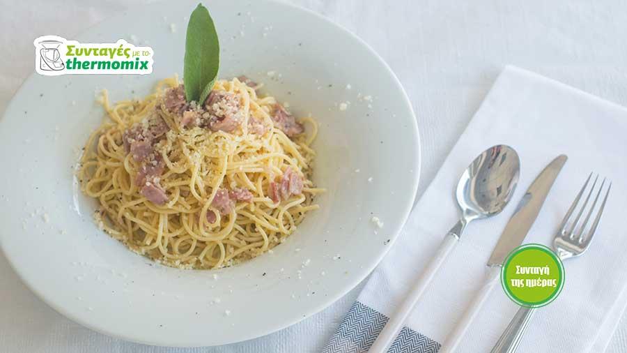 Προσθέστε 250 γρ. μπέικον σε μικρούς κύβους, τα φύλλα από 1 κλωνάρι φασκόμηλο, 1/2 κουταλάκι αλάτι, 1 πρέζα πιπέρι και σοτάρετε 8 λεπτά/120°C/αντίστροφη κίνηση/ταχύτητα 1. Προς το τέλος του χρόνου, μεταφέρετε τα σπαγγέτι που έχετε αφήσει στην άκρη σε μια πιατέλα για μακαρονάδες