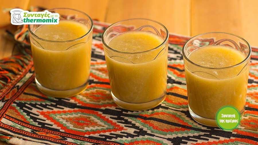 Βάλτε στον κάδο 500 γρ. λευκό σταφύλι, 300 γρ. μήλο σε κομμάτια, 1 /2 λεμμόνι καθαρισμένο χωρίς κουκούτσια, 100 γρ. παγάκια και πολτοποιήστε 30 δευτερόλεπτα/ταχύτητα 9.