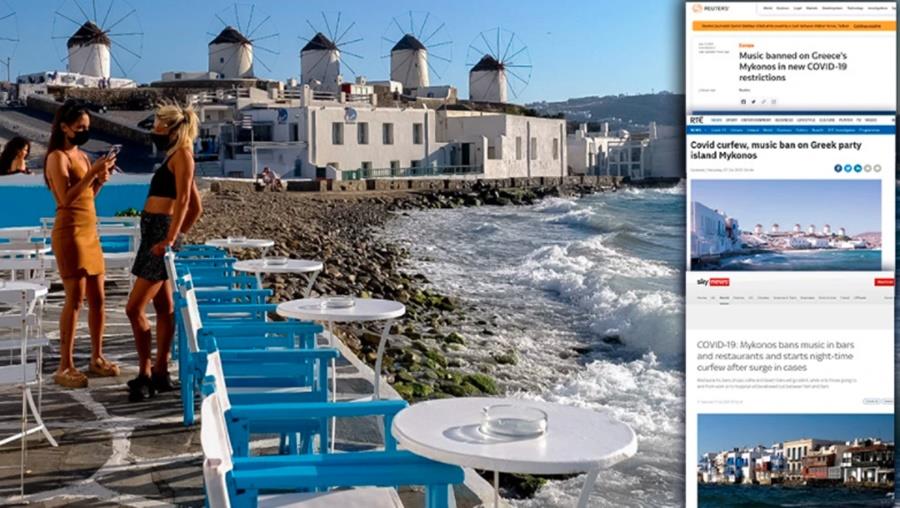 Το Reuters, τονίζει πως το δημοφιλής νησί της Μυκόνου «απαγορεύει τη μουσική σε εστιατόρια και μπαρ». Το νησί είναι γνωστό στέκι πλουσίων και αποτελεί πόλο έλξης για εκατομμύρια τουρίστες κάθε καλοκαίρι ανάμεσα στους οποίους και διάσημους αστέρες του Χόλιγουντ, μοντέλα και αθλητές. Σημειώνουν επίσης, πως η Ελλάδα εξαρτάται από τον τουρισμό και χρειάζεται απελπισμένα μια ισχυρή σεζόν ώστε να καλυφθούν τα κενά της προηγούμενης καταστροφικής χρονιάς.